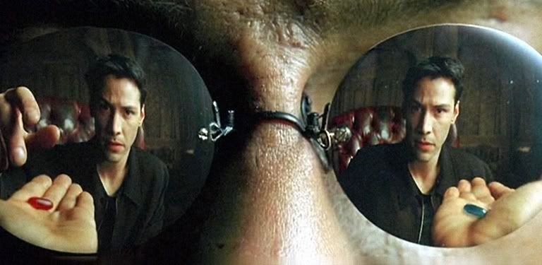 Der für das letzte Jahrtausend (..okay - eher Jahrzehnt..) des Bewegtbildes durch und durcher prägende Film, suggeriert uns in dieser Szene es gäbe eine "richtige" und eine '"falsche" Entscheidung bezüglich der Wahl der Pille. Es gibt also NUR Rot, oder Blau = richtig, oder falsch. Warum gibt es kein "Gar nix mach ich!" und "Das werde ich ganz bestimmt nicht schlucken!"? Ich glaube, weil so wischi-waschi-, und weder-noch-Definitionen im richtigen Leben (als Graustufen zwischen "richtig" und "falsch" bekannt, und in Streit- und Kompromissmanövern oft und gerne zitiert) zwar durchaus berechtigt und notwendig, im Film jedoch meist absolut uninteressant sind.